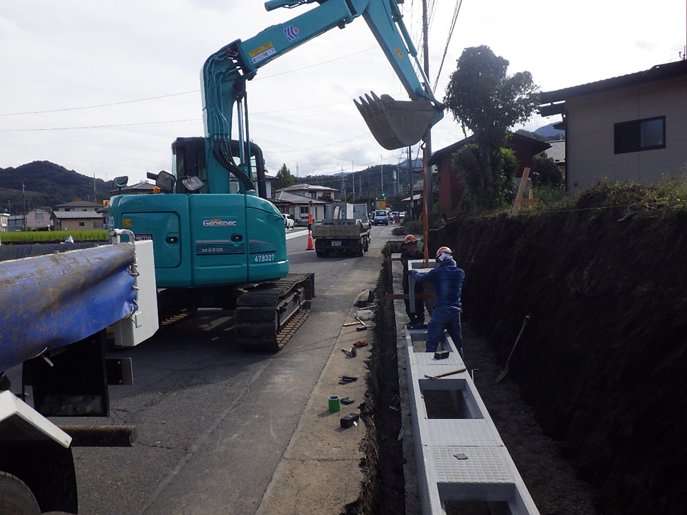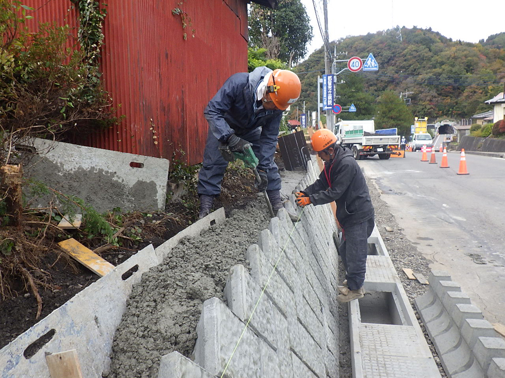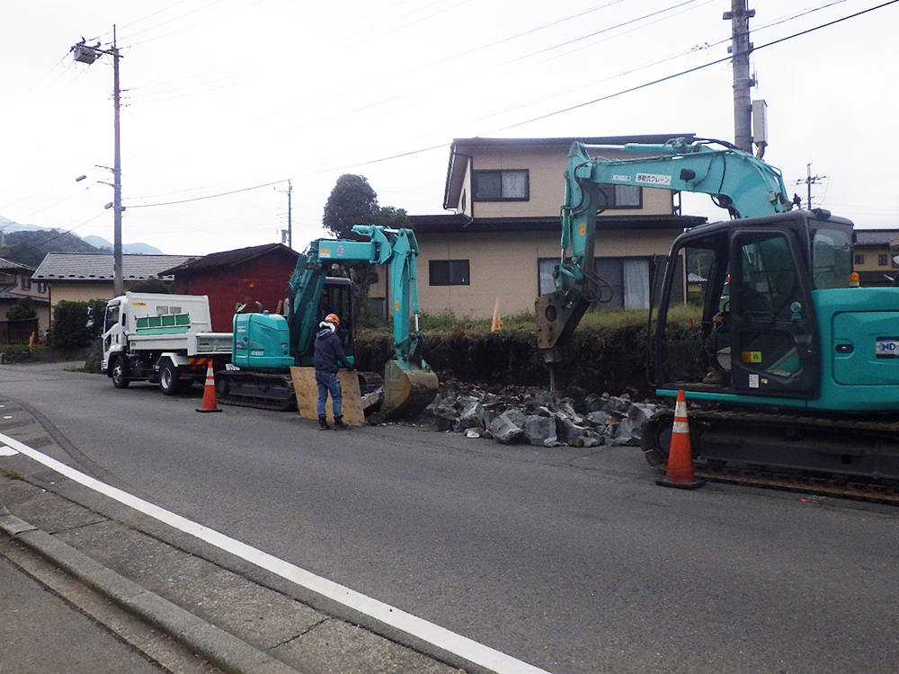 高畑谷村停車場線 道路工事 10月、11月 排水構造物工、ブロック積工 工事着手前 既設構造物撤去 水路設置 ブロック積 ブロック積 (一)(余フ) 道路改良工、排水構造物工、コンクリートブロック積工、舗装工